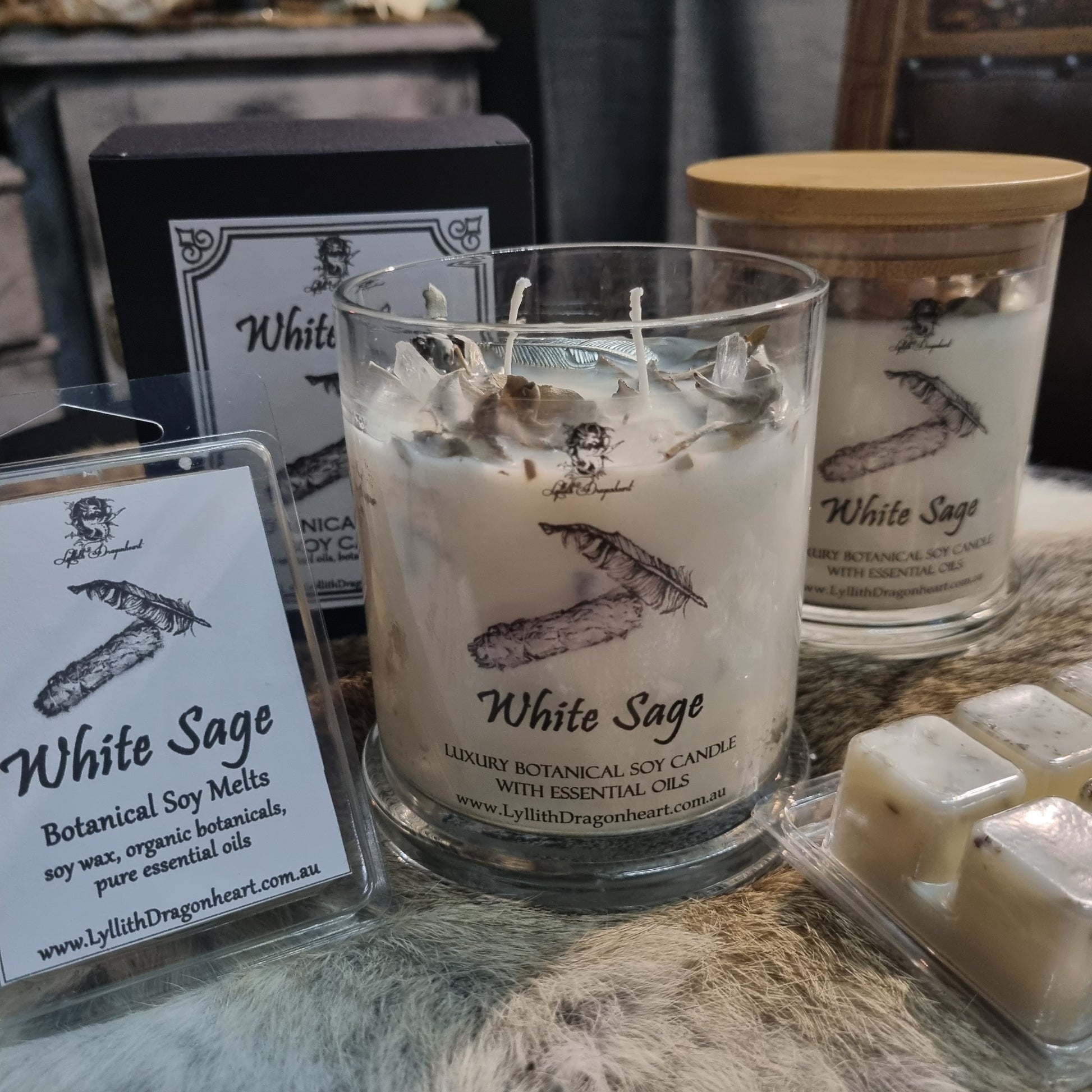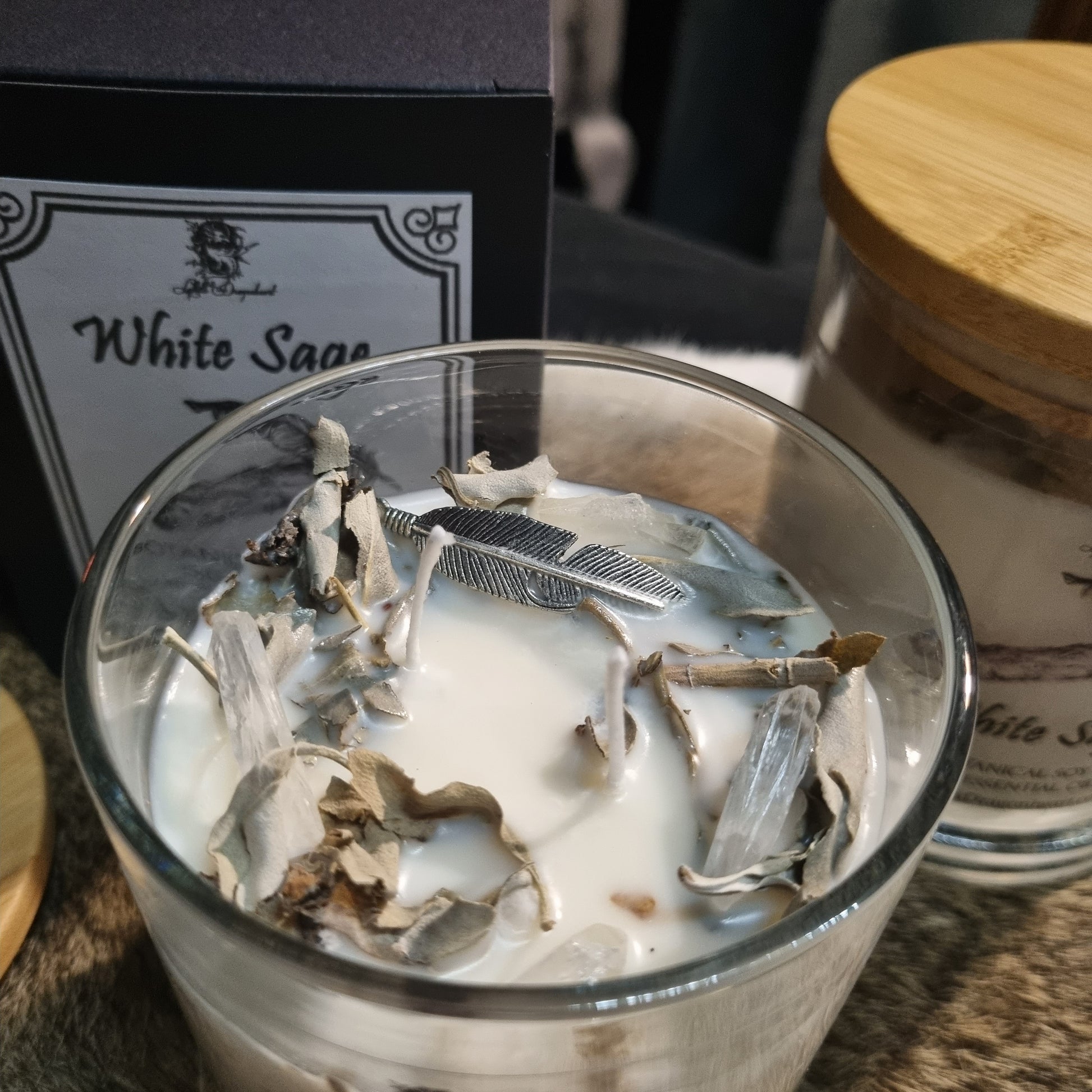 Handpoured into beautiful glass jars with bamboo lids, which are easy to clean with hot soapy water once your candle has finished burning all the way so you can reuse them for all kinds of things - a sprinkle of organic herbs, crystals added with appropriate charm and packaged in elegant black boxes, making them perfect for gifts!