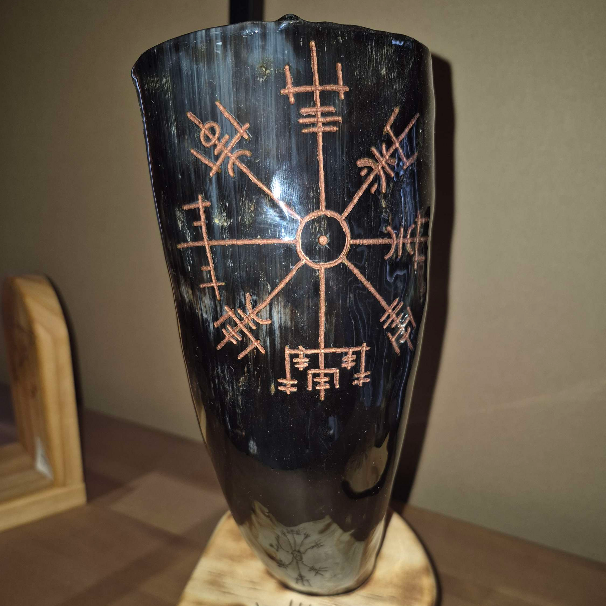 Large Drinking Horn featuring a Copper coloured Vegvisir - with matching hand-made wooden stand.