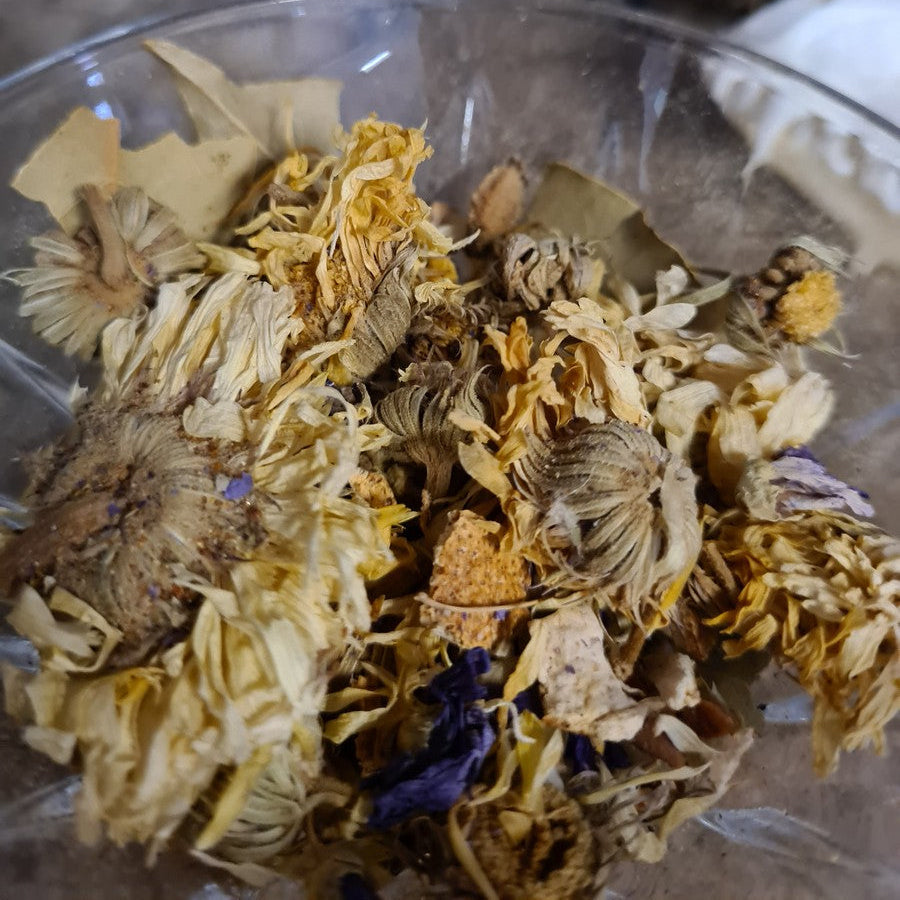 Contains organic herbs and resins of masculine energies including Calendula flowers, Bay Leaves, Star Anise, Mallow and a couple of others.